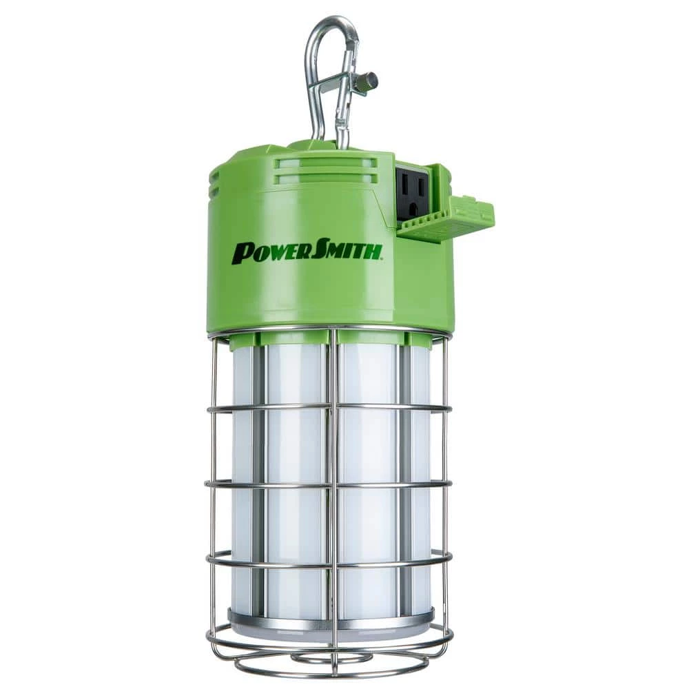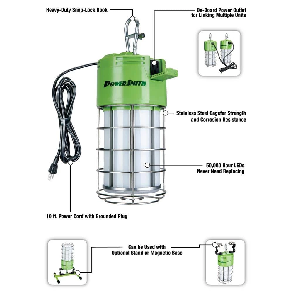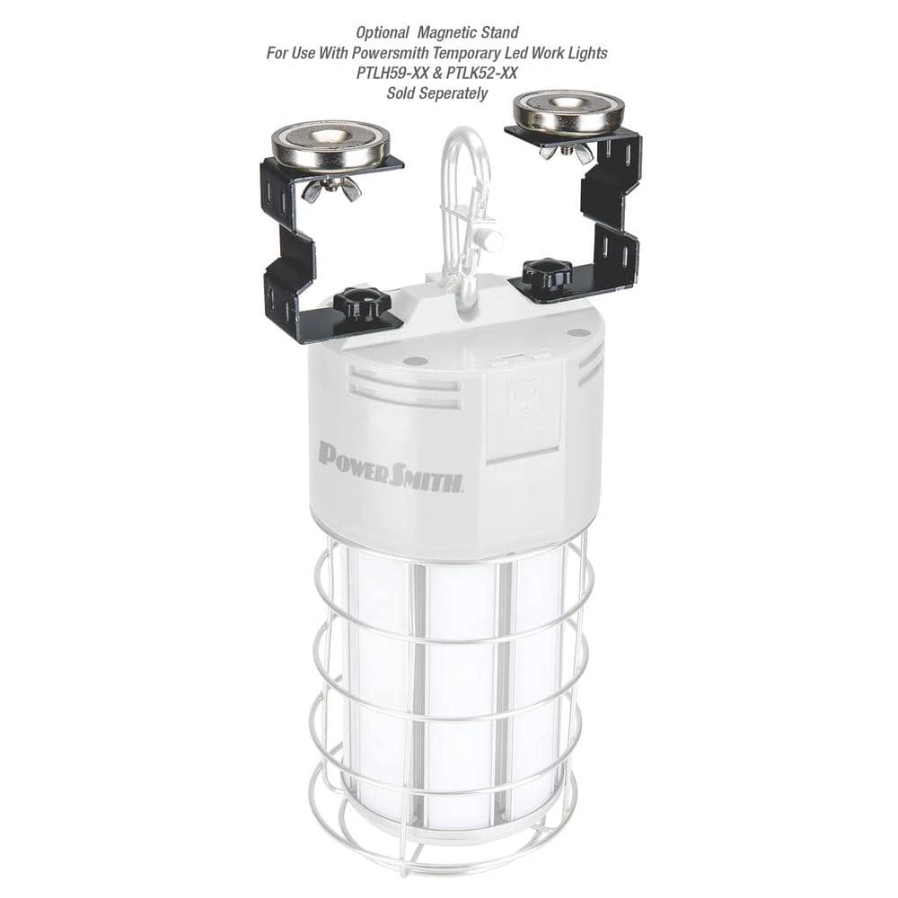 The ALL NEW Power Smith 12,000 Lumens High Bay LED Temporary Work Light delivers brilliant 5,000K light for your next industrial project. Whether it’s lighting a hallway for a remodel or lighting a work area on the job, these High Bay LED lights lead in Lumens and capability. A metal hasp secures the hanging light and a 10 ft. cord can be used to connect multiple high bay lights together with an onboard outlet for daisy chained operation. The all metal cage surrounding the light ensures that your light is ready for commercial and industrial use. An optional magnetic stand or metal stand can be purchased separately to increase the versatility of the light as well.