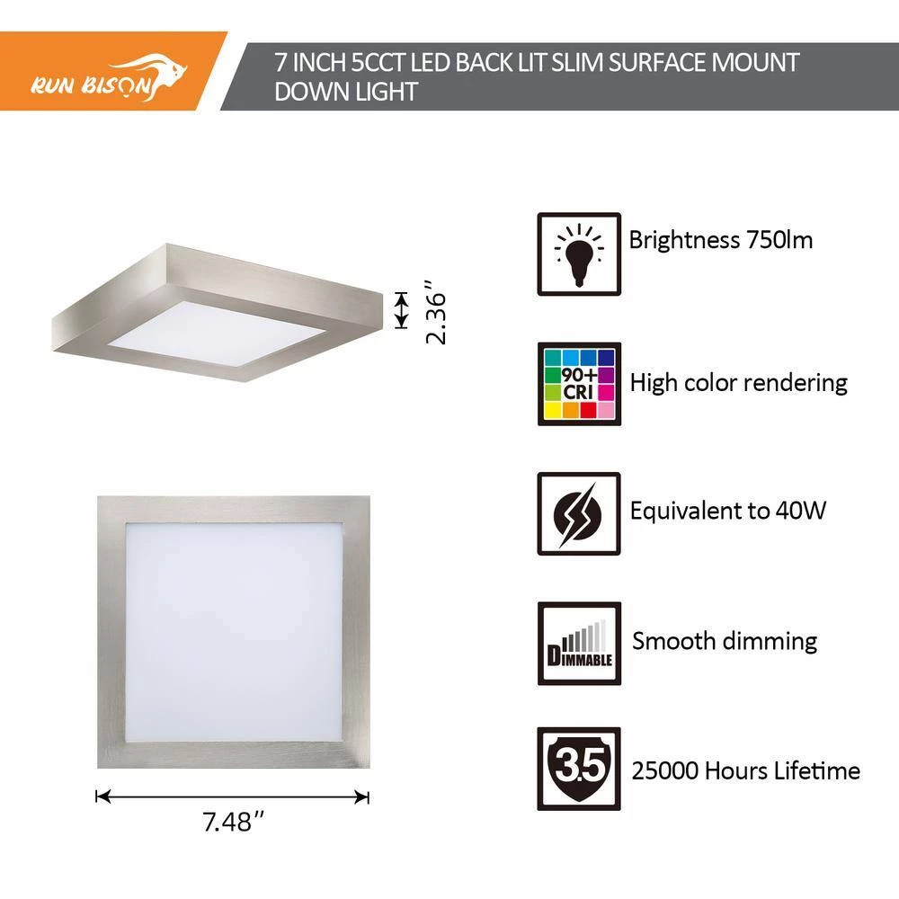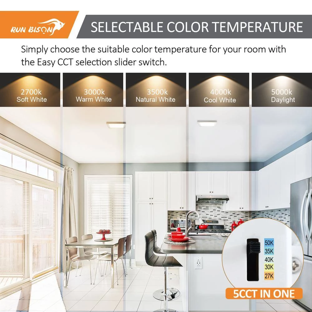This elegant design product can provide exceptional performance in general lighting application and can also serve as a cost effective temporary lighting solution. The flush mount LED downlight provide 5 color temperatures of 2700K soft white, 3000K warm white, 3500K natural white, 4000K cool white or 5000K daylight for selection, you can choose the most suitable light for the living room, bedroom, bathroom and other areas according to your preferences. The RUN BISON flush mount Offers high brightness with 750 Lumens output equivalent to 40-Watt incandescent, comes with 90 plus CRI provides superior color rendering. Featuring Driver on Board technology that increases performance and reliability. The flush mount match most TRIAC dimmers in the market, smooth dimming range from 10% to 100%.This canless LED downlight is proved for top quality standard and safe operation. ETL-Listed for your safety we uphold the highest standards for all our products by testing each product for optimal performance and safety. Our LED retrofit downlights are instant on with the latest in LED flicker -free technology for maximum eye comfort.