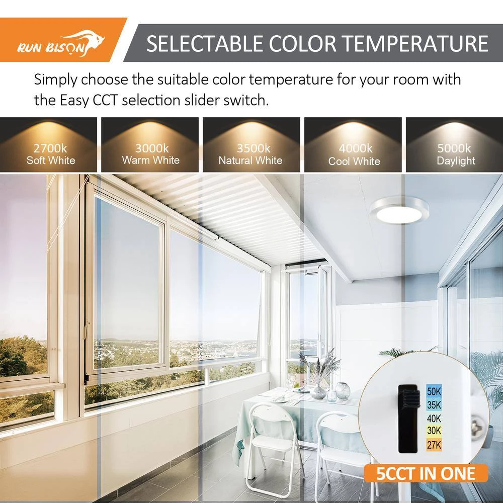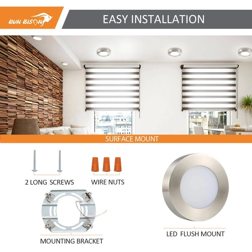 This elegant design product can provide exceptional performance in general lighting application, and can also serve as a cost effective temporary lighting solution. The flush mount LED downlight provide 5 color temperatures of 2700K soft white, 3000K warm white, 3500K natural white, 4000K cool white or 5000K daylight for selection, you can choose the most suitable light for the living room, bedroom, bathroom and other areas according to your preferences. The RUN BISON flush mount Offers high brightness with 1, 050 Lumens output equivalent to 60-Watt incandescent, comes with 90 plus CRI provides superior color rendering. Featuring Driver on Board technology that increases performance and reliability. The flush mount match most TRIAC dimmers in the market, smooth dimming range from 10% to 100%. This canless LED downlight is proved for top quality standard and safe operation. ETL-Listed for your safety we uphold the highest standards for all our products by testing each product for optimal performance and safety. Our LED retrofit downlights are instant on with the latest in LED flicker -free technology for maximum eye comfort.