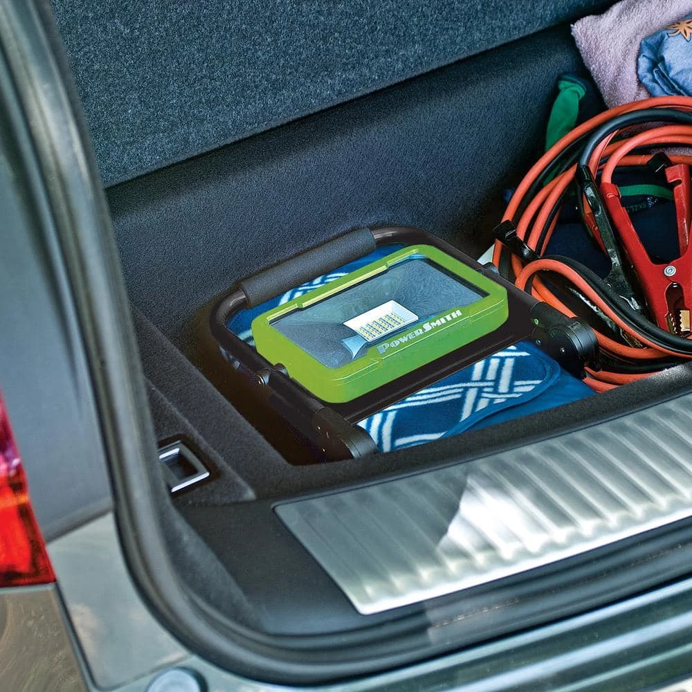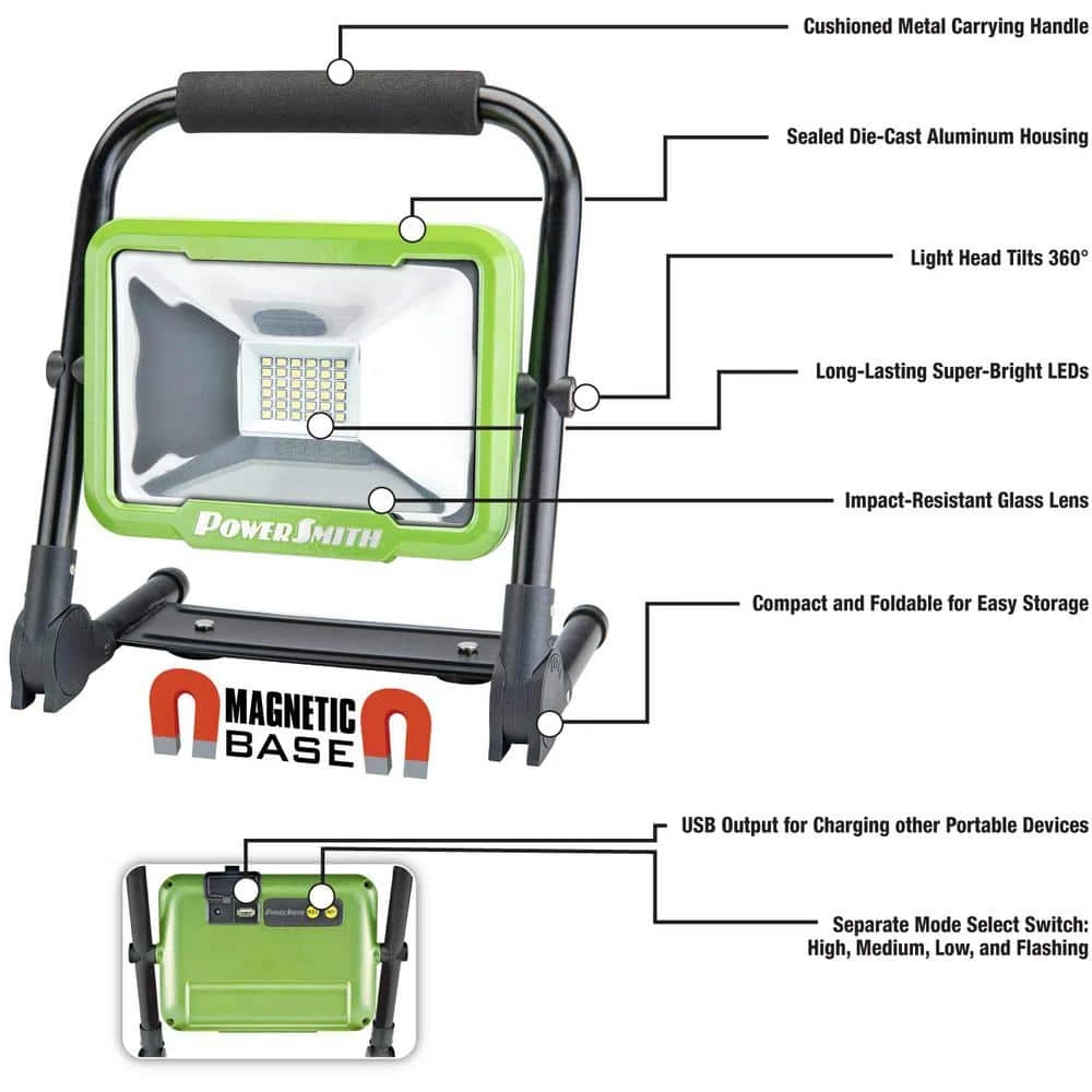PowerSmith brings innovation and performance together in the NEW Foldable magnetic LED work light with 2,400 TRUE Lumen output. Rugged yet stylish design are blended in an all steel construction light that folds flat for storage and charges your mobile devices for emergency use. Stay ready for the storm with up to 8-hour of runtime and 18-months of availability at full charge when not in use. Rotate the lamp head 360° and adjust the magnetic folding stand with 5 detent positions to get light exactly where it’s need during snow, rain, sleet or hail. Buy with confidence from PowerSmith with a 2-Year Warranty today.