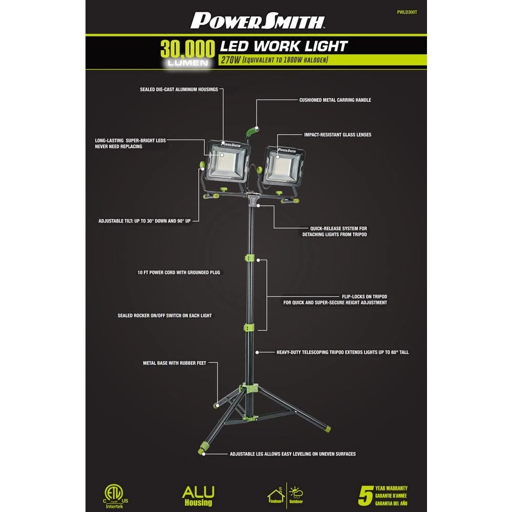 Get Professional results with the Professional Grade 30,000 Lumens Dual Head LED Tripod Work Light from PowerSmith. PowerSmith leads the way with more lumens per dollar value in every PowerSmith work light product. The lamp heads can be removed from the tripod stand with a flip of the quick release clip mechanism. The ALL metal adjustable tripod features flip locks to quickly and easily lock and unlock the height of the tripod.