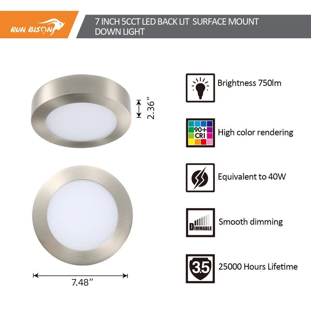 4-Pack 7 in. Round Color Brushed Nickel Selectable Integrated LED Flush Mount Downlight by RUN BISON