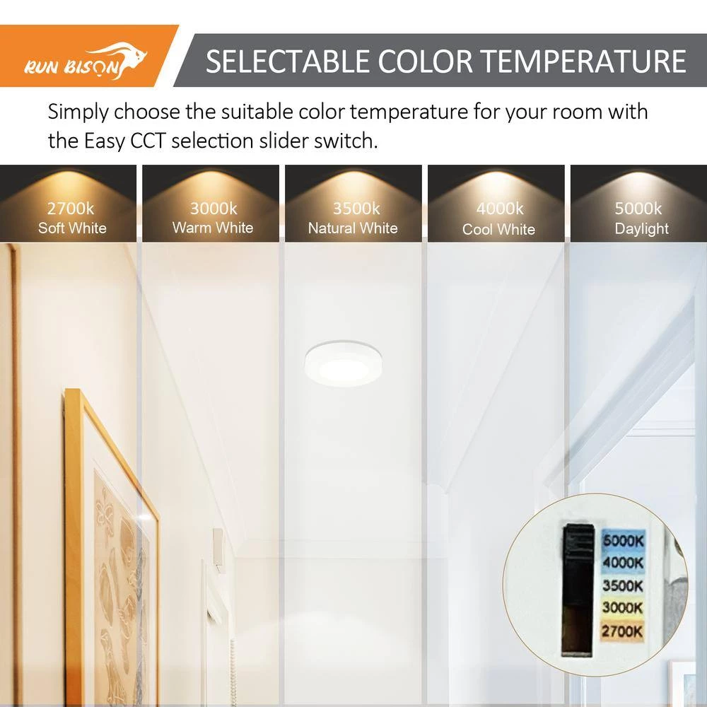 This elegant design product can provide exceptional performance in general lighting application, and can also serve as a cost effective temporary lighting solution.The flush mount LED downlight provide 5 color temperatures of 2700K soft white, 3000K warm white, 3500K natural white, 4000K cool white or 5000K daylight for selection, you can choose the most suitable light for the living room, bedroom, bathroom and other areas according to your preferences. The RUN BISON flush mount Offers high brightness with 1, 050 Lumens output equivalent to 60-Watt incandescent, comes with 90 plus CRI provides superior color rendering. Featuring Driver on Board technology that increases performance and reliability. The flush mount match most TRIAC dimmers in the market, smooth dimming range from 10% to 100%. This canless LED downlight is proved for top quality standard and safe operation. ETL-Listed for your safety we uphold the highest standards for all our products by testing each product for optimal performance and safety. Our LED retrofit downlights are instant on with the latest in LED flicker -free technology for maximum eye comfort.