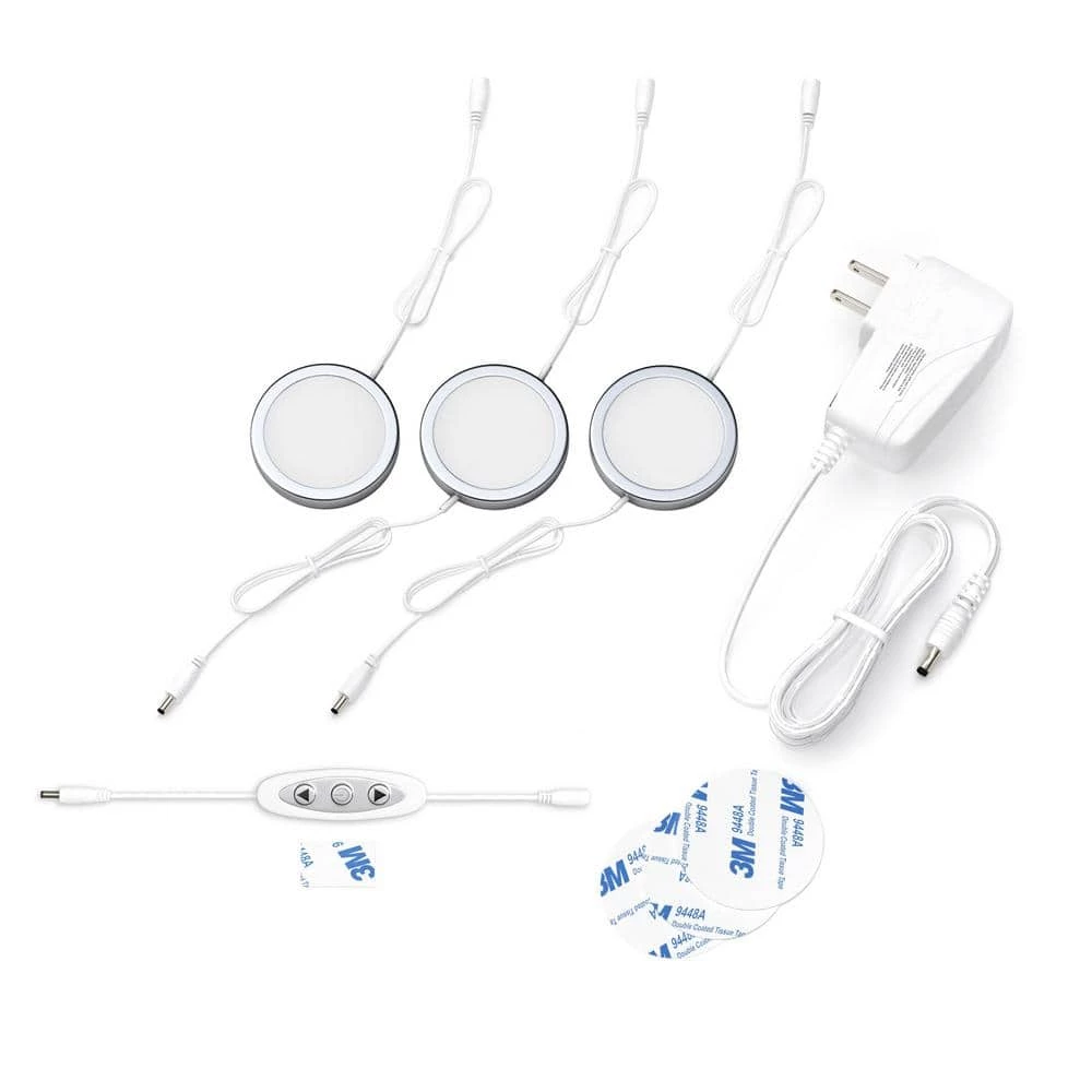 - Included: 3 LED puck lights, 15 wire clips with 3M sticker, three 3M double-sided stickers, one 12-Watt power supply (with 4.9 ft. cord), 1 dimmer switch