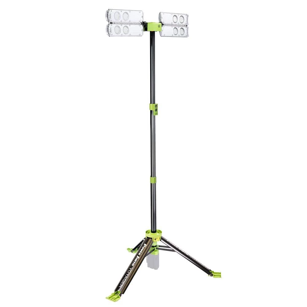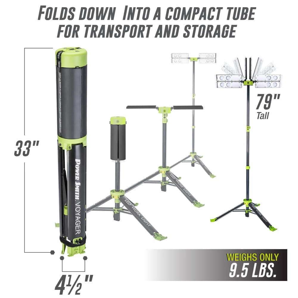 The New PowerSmith Voyager 8000 Lumen Collapsible LED Work Light with 3-Way Power options is the perfect solution for your commercial, industrial, job-site, and home project lighting needs. Whether you are Painting, Hanging drywall, Prepping the job site, Setting up a photo shoot, Lighting up a factory work station, Playing basketball in the driveway, Hosting a backyard barbeque, Playing volleyball at the beach, or Lighting up a campsite, the 4 adjustable light heads and telescoping tripod will project the light where it is needed.Voyager can be powered by a PowerSmith 12V 8.8Ah Li-Ion Battery (not included) for 1-1/2 hours at the full 8000 lumens, and up to 6 hours at 2000 lumens on a single charge! You can also purchase an optional AC adapter and power your Voyager non-stop from any 120V electrical outlet or extension cord. And (hold on to your hard hats!) – you can purchase an optional DC adapter and power your Voyager with a Makita, DeWalt, or Milwaukee Power Tool Battery!The Voyager 8000 Integrated Aluminum Tripod Telescopes the light up to 79″ Tall and also folds down into a super-compact tube for transportation and storage. At 4-1/2″ by 33″ and weighing only 9.5 lbs., the collapsed Voyager can be moved and stored easily -place it in the cab of your truck instead of in the back, where it can get damaged or stolen.PVLR8000A-C Voyager includes shoulder strap, foot spikes, and remote. No Tools or Assembly required.