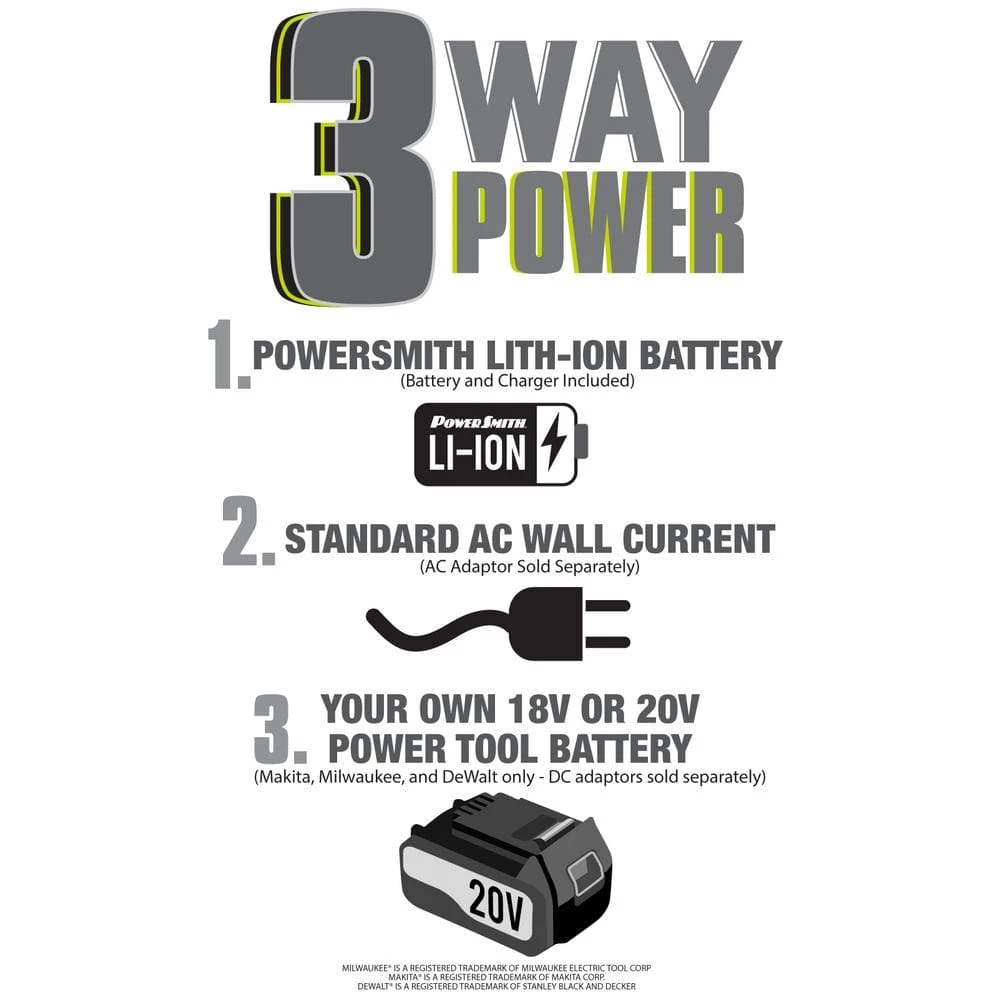 - OPTIONAL 3-WAY POWER – Operates using PowerSmith PVLAB121 Li-ion battery (Included), standard 120V wall AC power (Requires purchase of AC adaptor), or an 18V/20V power tool battery: Makita, Milwaukee or DeWalt (Requires purchase of DC adaptor for each power tool brand)