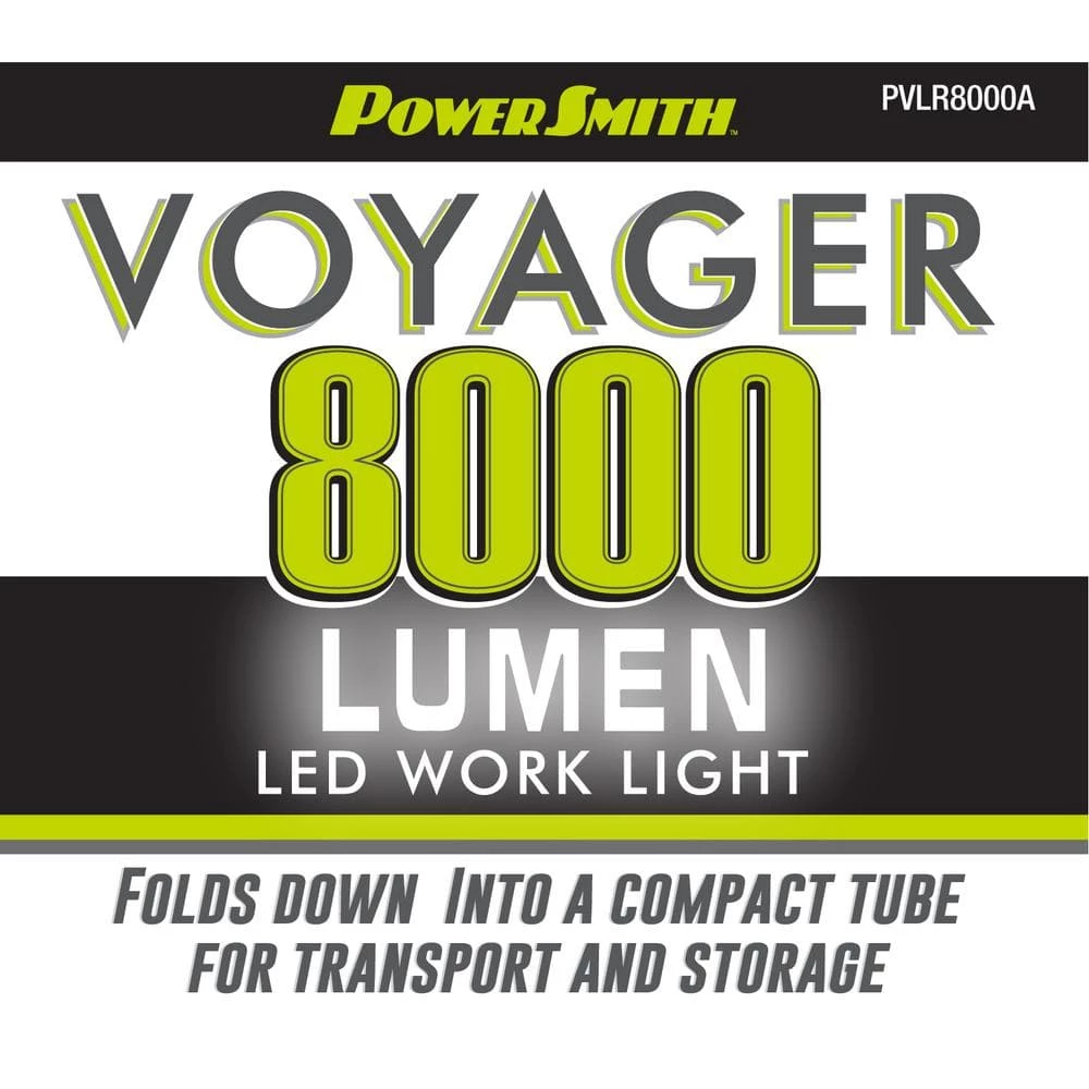 The New PowerSmith Voyager 8000 Lumen Collapsible LED Work Light with 3-Way Power options is the perfect solution for your commercial, industrial, job-site, and home project lighting needs. Whether you are Painting, Hanging drywall, Prepping the job site, Setting up a photo shoot, Lighting up a factory work station, Playing basketball in the driveway, Hosting a backyard barbeque, Playing volleyball at the beach, or Lighting up a campsite, the 4 adjustable light heads and telescoping tripod will project the light where it is needed. Your Voyager comes with a 12V 8.8Ah Li-Ion Battery that will power the light for 1-1/2 hours at the full 8000 lumens, and up to 6 hours at 2000 lumens on a single charge! You can also purchase an optional AC adapter and power your Voyager non-stop from any 120V electrical outlet or extension cord. And you can purchase an optional DC adapter and power your Voyager with a Makita, DeWalt, or Milwaukee Power Tool Battery! The Voyager 8000 Integrated Aluminum Tripod Telescopes the light up to 79″ Tall and also folds down into a super-compact tube for transportation and storage. At 4-1/2″ by 33″ and weighing only 9.5 lbs., the collapsed Voyager can be moved and stored easily -place it in the cab of your truck instead of in the back, where it can get damaged or stolen. Model PVLR8000A Voyager comes with battery, charger, carrying bag, shoulder strap, foot spikes, and remote to control the light modes and power on/off. No Tools or Assembly required.