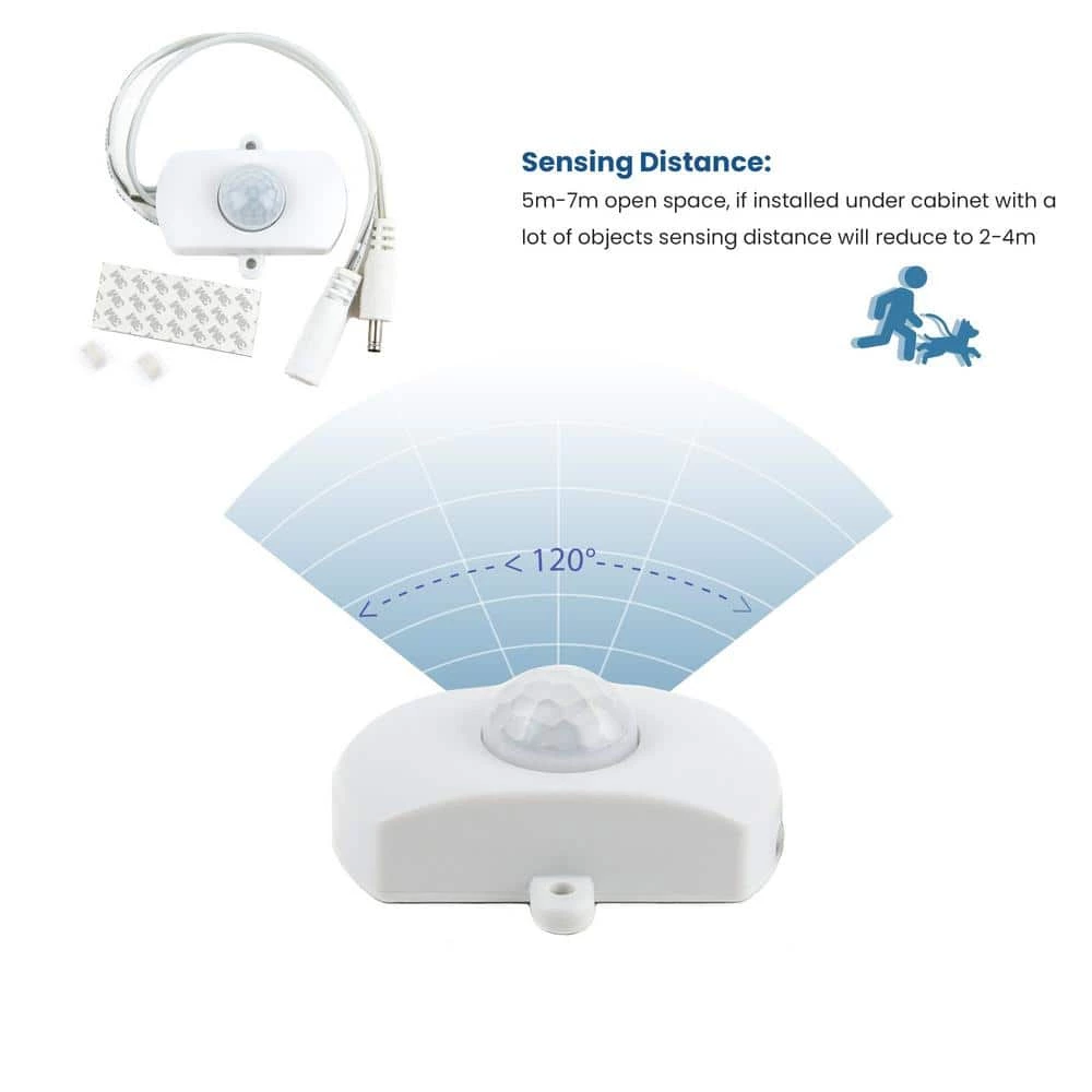 ESHINE motion sensor switch. For use INDOOR ONLY. Operating-Voltage: 5-24-Volt DC. Delay Range: 15s by default (2-360s adjustable). Sensing Distance: 5m-7m open space, if installed under cabinet with a lot of objects sensing distance will reduce to 2-4m. Sensing Angle: 120°.